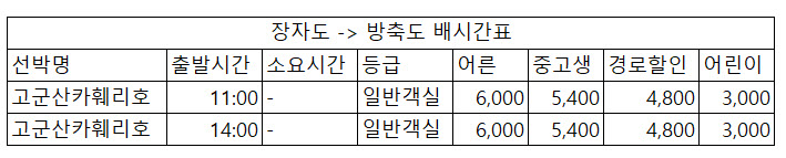 장자도항 방축도 배시간표는 다음과 같습니다.