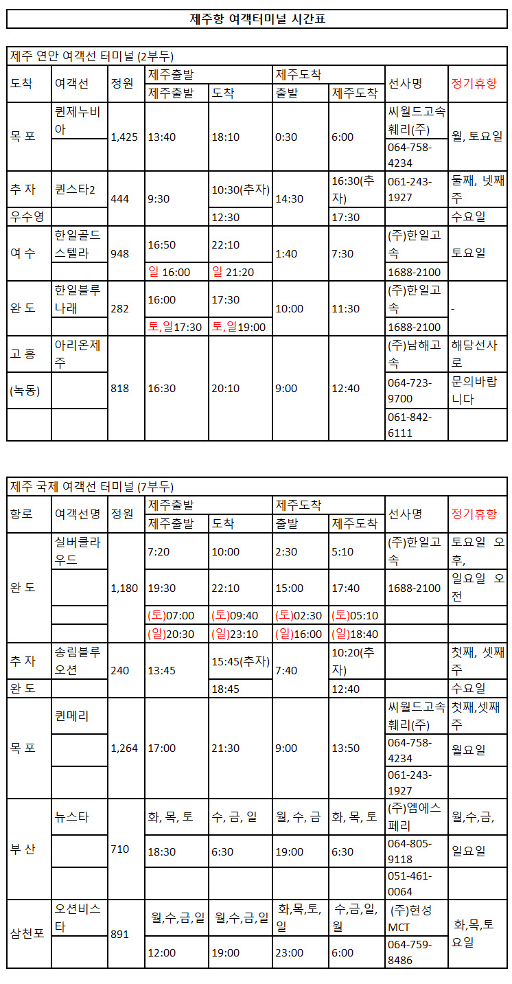 제주항 여객터미널 시간표는 다음과 같습니다.
