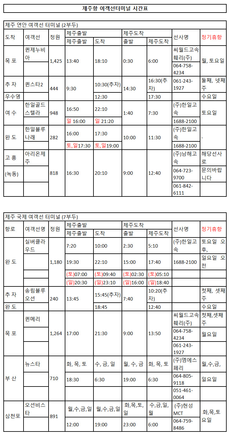 제주항 여객선터미널 시간표는 다음과 같습니다.