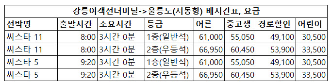 | 강릉여객선터미널->울릉도(저동항) 배시간표, 요금 | |||||||