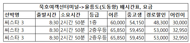 | 선박명 | 출발시간 | 소요시간 | 등급 | 어른 | 중고생 | 경로할인 | 어린이 |