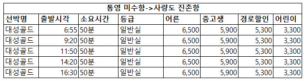 | 선박명 | 출발시각 | 소요시간 | 등급 | 어른 | 중고생 | 경로할인 | 어린이 |