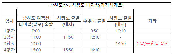 | 항차 | 삼천포 여객선 | 사량도 출발 | 수우도 출발 | 사량도 출발 | 기타 |