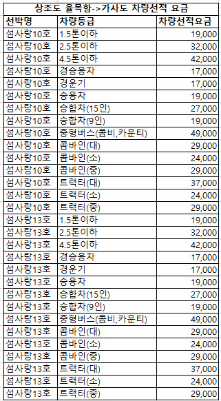 상조도 율목항 출발 가사도 도착 차량선적요금은 다음과 같습니다