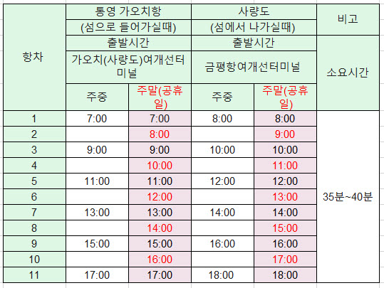 가오치항, 가오치선착장 배편 시간표(주말)