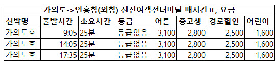 | 가의도호 | 17:00 | 25분 | 등급없음 | 3,100 | 2,800 | 2,500 | 1,600 |