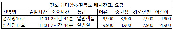 | 섬사랑13호 | 11:01 | 2시간 44분 | 일반실 | 9,900 | 8,900 | 7,900 | 4,900 |