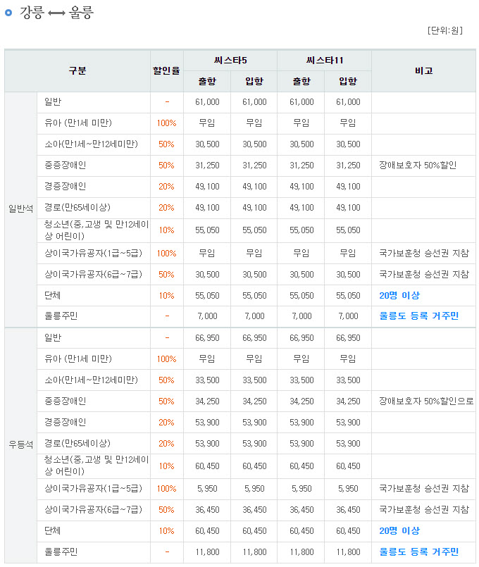 강릉항에서 울릉도 배편 요금, 경로할인, 학생할인, 할인요금은 다음과 같습니다.