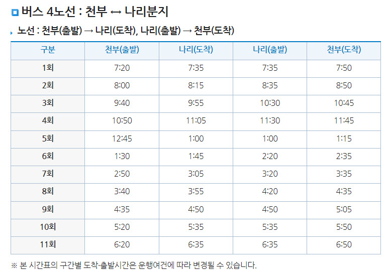 | 구분 | 천부(출발) | 나리(도착) | 나리(출발) | 천부(도착) |
