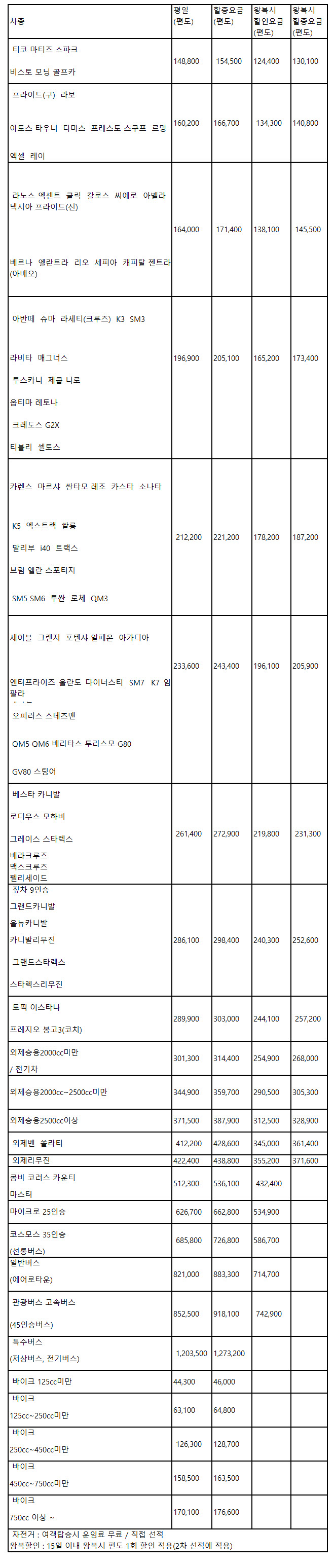부산항 제주도 배편 차량선적 요금은 다음과 같습니다.