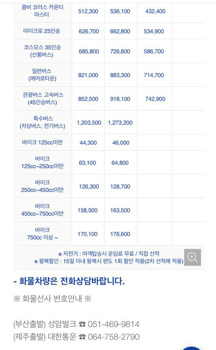 부산항 제주도 배편 차량선적 요금