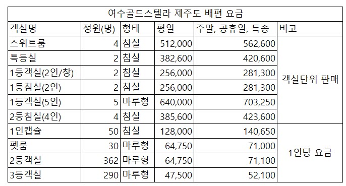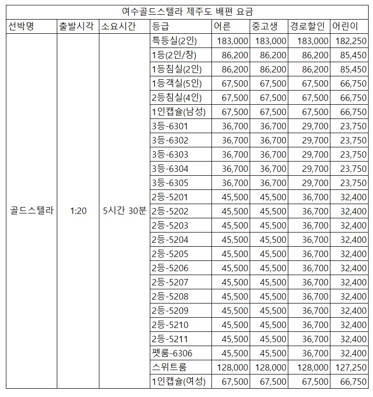 여수골드스텔라 제주도 배편 요금은 다음과 같습니다.