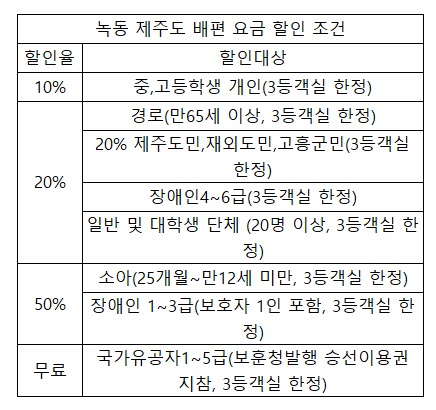녹동 제주도 배편 요금 할인 조건은 다음과 같습니다.