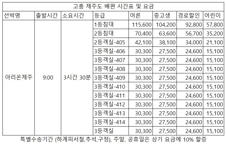 고흥 제주도 배편 요금은 다음과 같습니다.