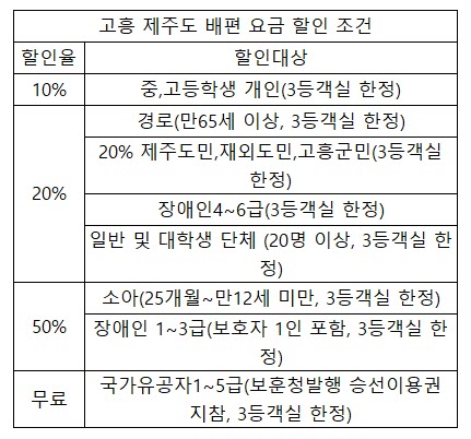 고흥 제주도 배편 요금 할인 조건은 다음과 같습니다.