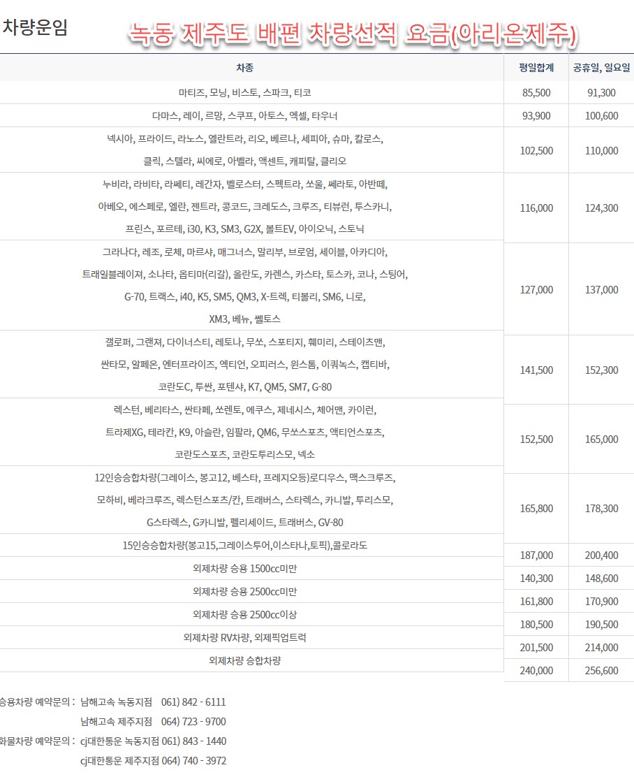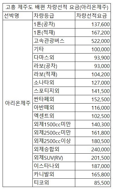 고흥 제주도 배편 차량선적 요금(아리온제주) |