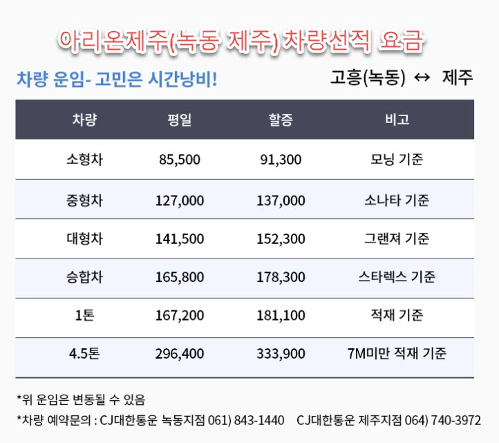 아리온제주 제주도 배편 차량선적 요금은 다음과 같습니다.