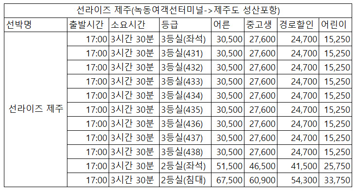 선라이즈제주 제주도 배편 시간표는 다음과 같습니다.