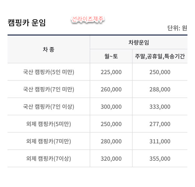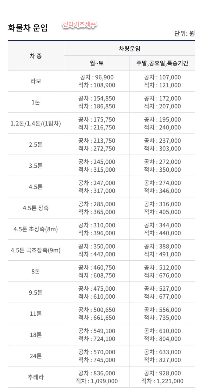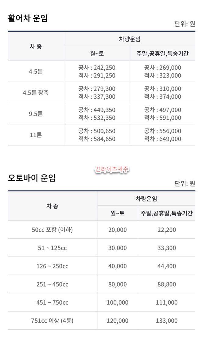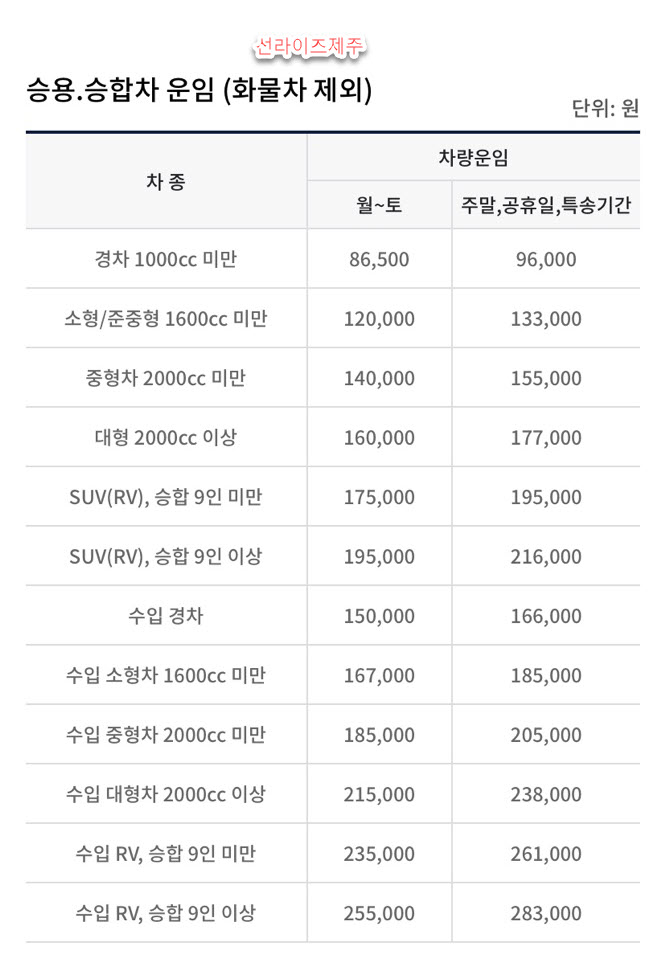 선라이즈제주 제주도 배편 차량선적 요금은 다음과 같습니다.