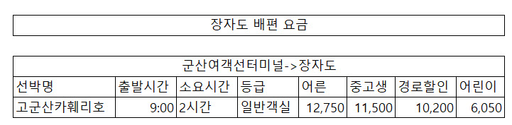 장자도 배편 요금은 다음과 같습니다.